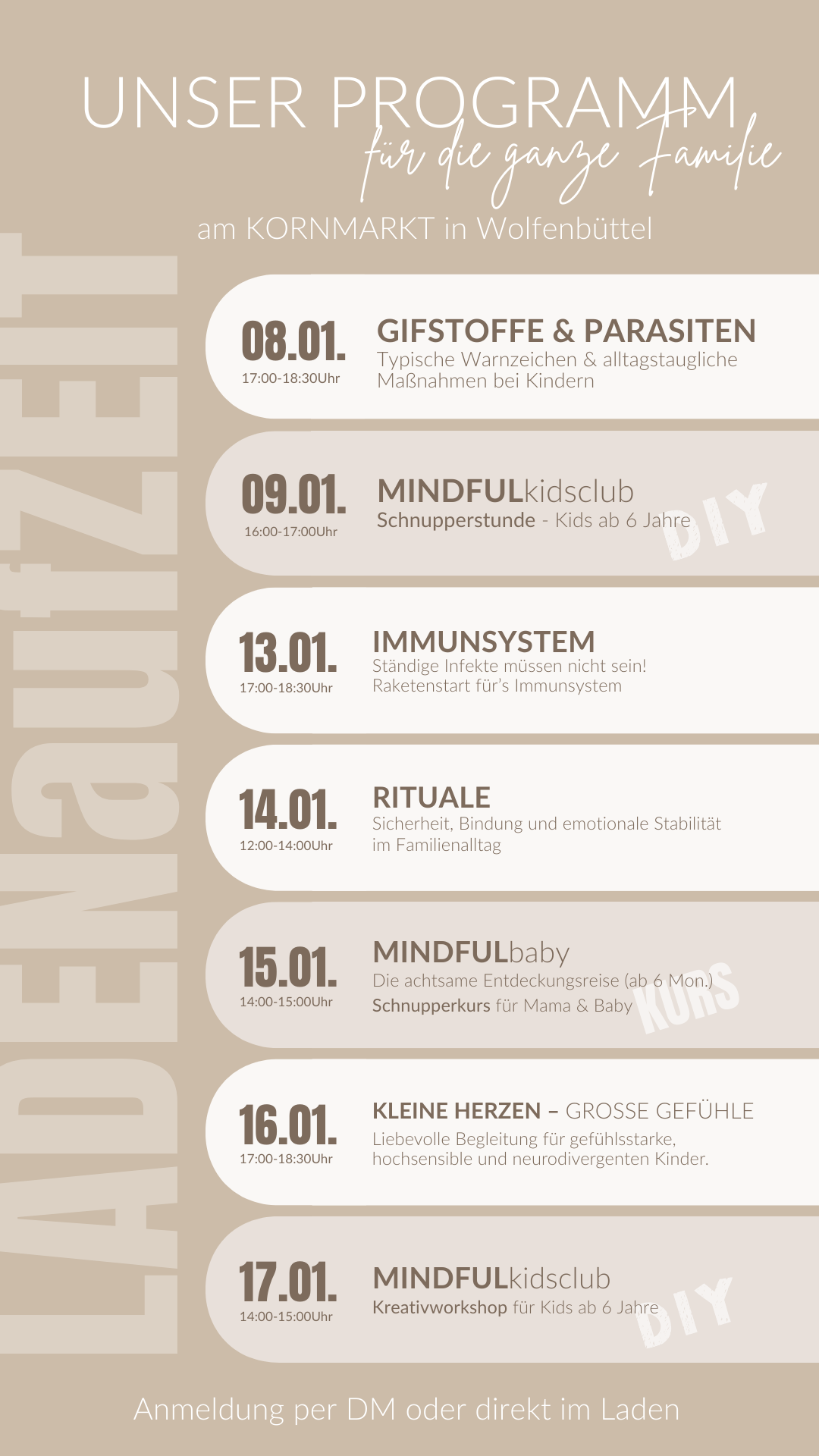 Der LADEN auf ZEIT ist eine Einladung an dich und deine Familie, ganz unverbindlich vorbeizukommen, uns kennenzulernen und in das Kursangebot hineinzuschnuppern. Ob neugierig, suchend oder einfach offen für neue Impulse – du bist herzlich willkommen.